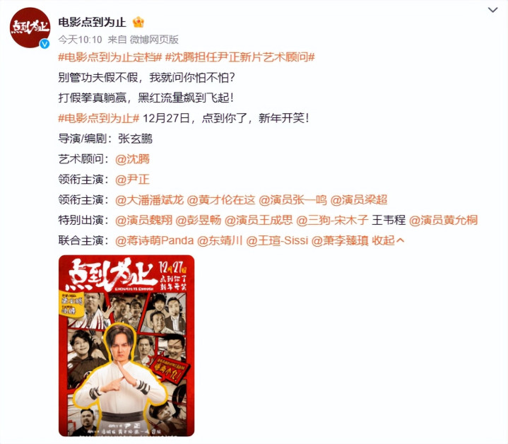 电影《点到为止》已经官宣定档于12月27日上映,由沈腾担任艺术顾问,尹正领衔主演,还有潘斌龙加盟,我有预感,等到上映,这部喜剧大片的票房绝对要炸!
